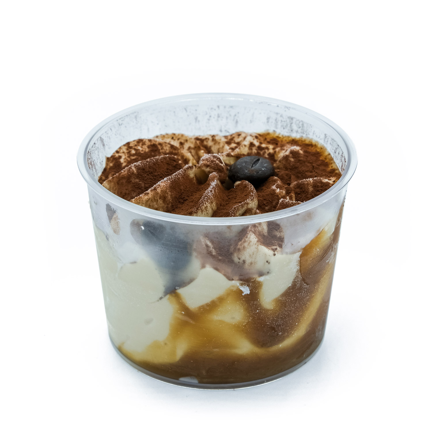 Ambachtelijk ijsdessert met cappuccino ijs gemaakt met verse hoevemelk omhuld in een huisgemaakte saus op basis van koffie en karamel. Afgewerkt met mokkabonen en cacaopoeder.